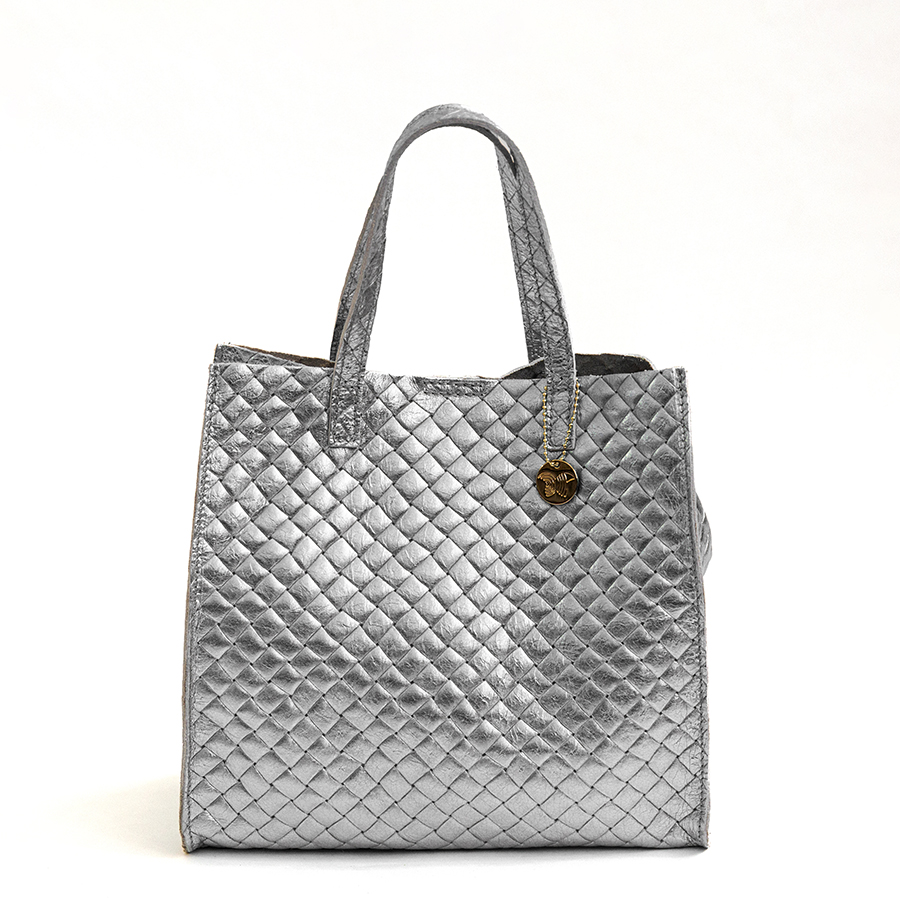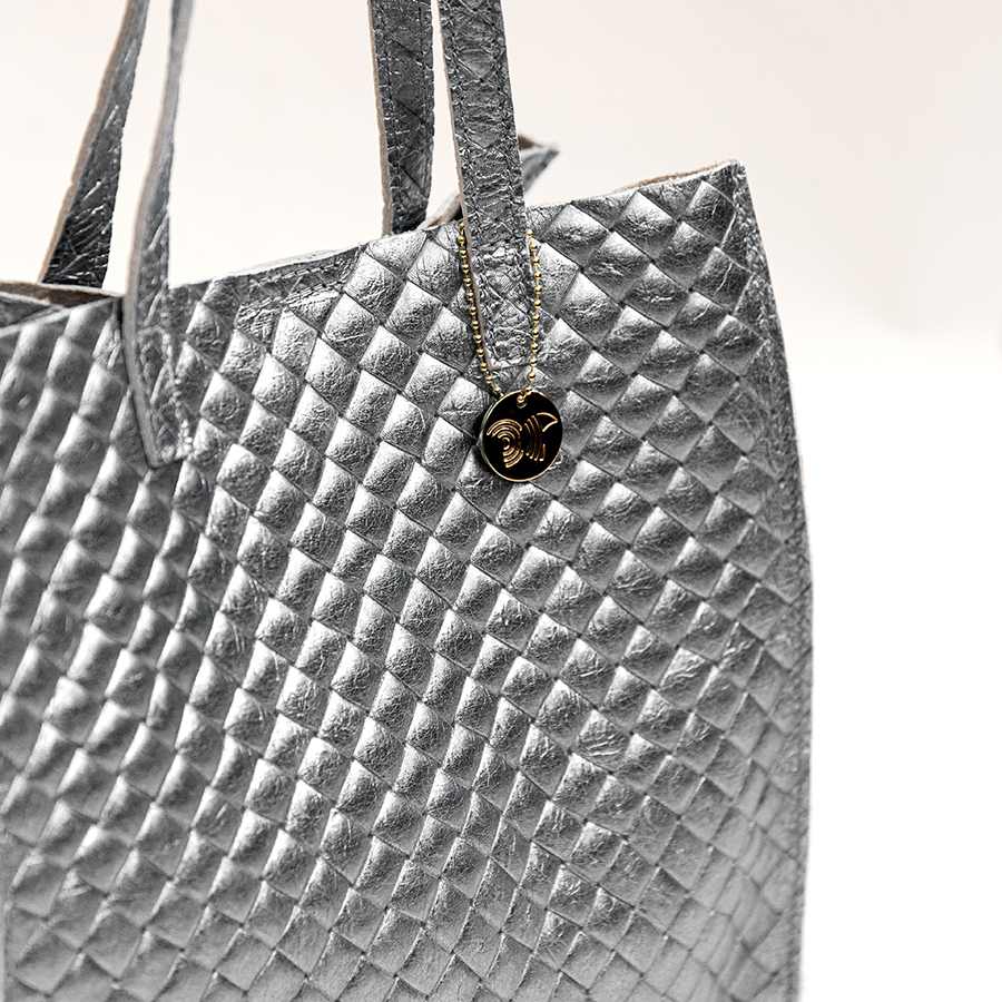 Originale shopping in pelle dollaro stampa intreccio con doppio manico, tracolla applicabile e chiusura a calamita. Interno sfoderato con pratico bustone porta oggetti che si può indossare anche separatamente.