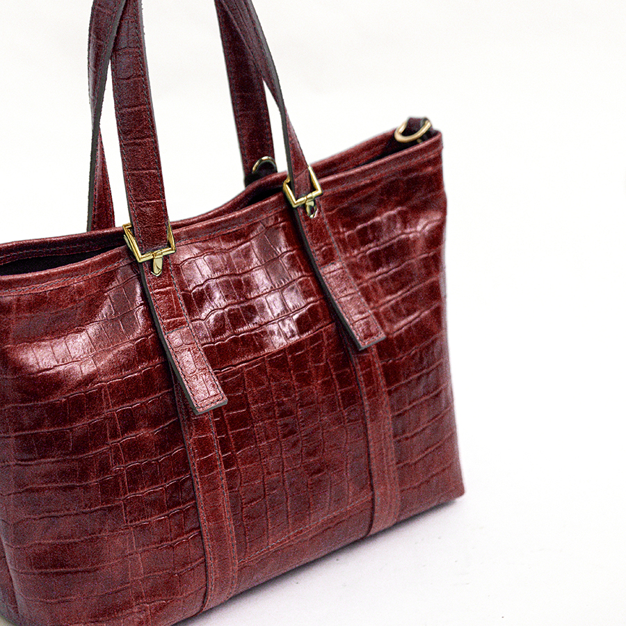 Borsa di medie dimensioni realizzata in pelle stampa cocco. Doppio manico, tracolla applicabile e tasca frontale. Interno foderato con tasche.