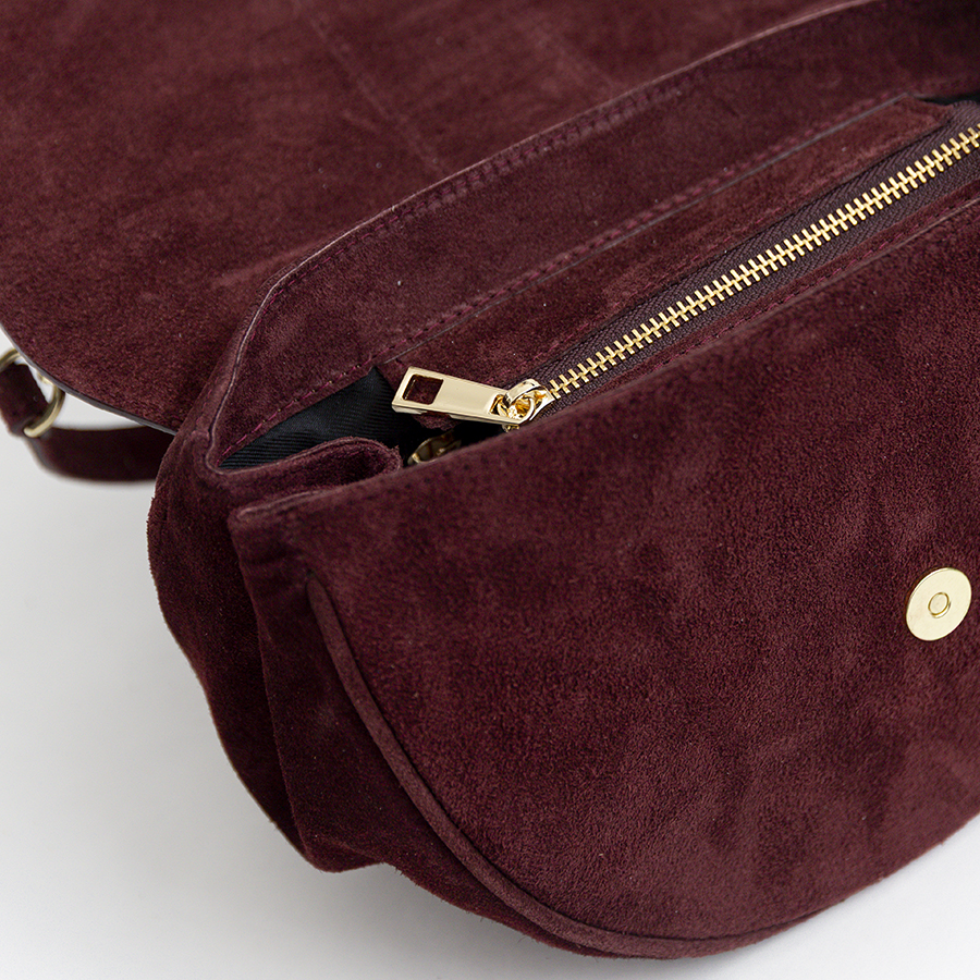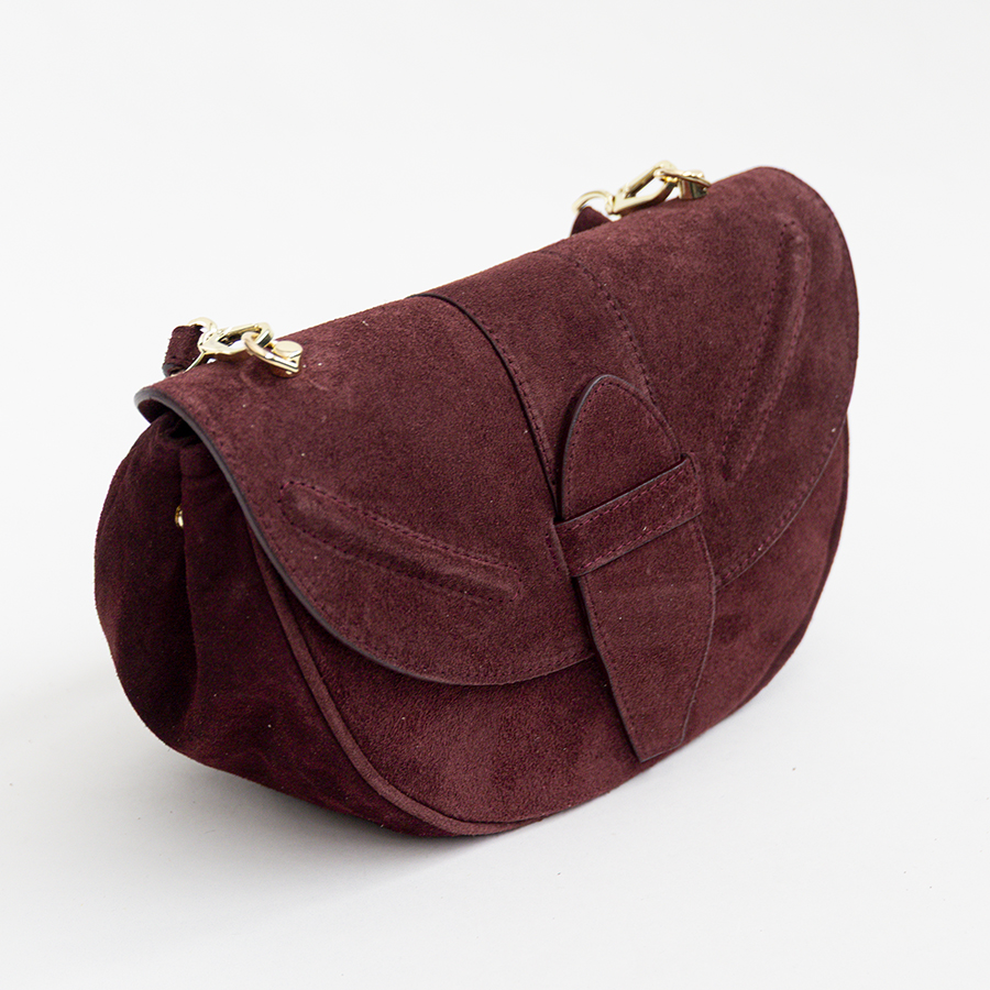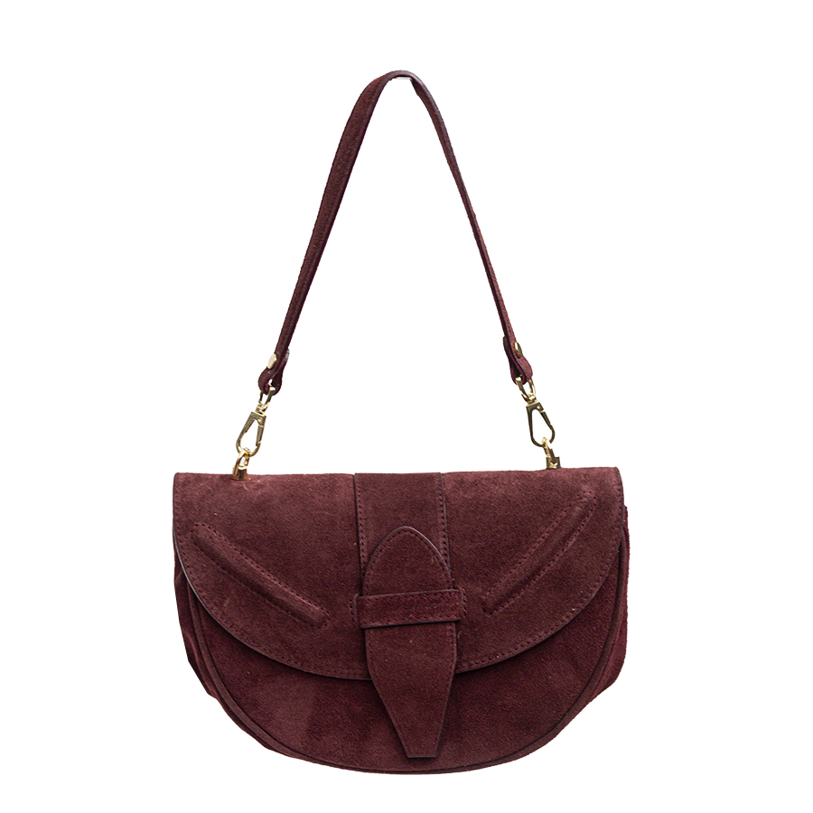 Ideale dal giorno alla sera postina stondata di medie dimensioni in camoscio. Chiusura a patta, manico e tracolla applicabile, cuciture a vista. interno foderato con tasche, accessori colore oro.