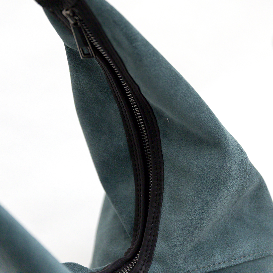 Borsa capiente e funzionale. Sacca di medie dimensioni in camoscio con chiusura a zip e cuciture a vista. Manico singolo ampio sottospalla. interno foderato con tasche interne, accessori colore canna fucile.