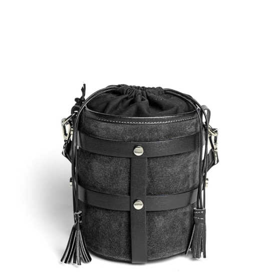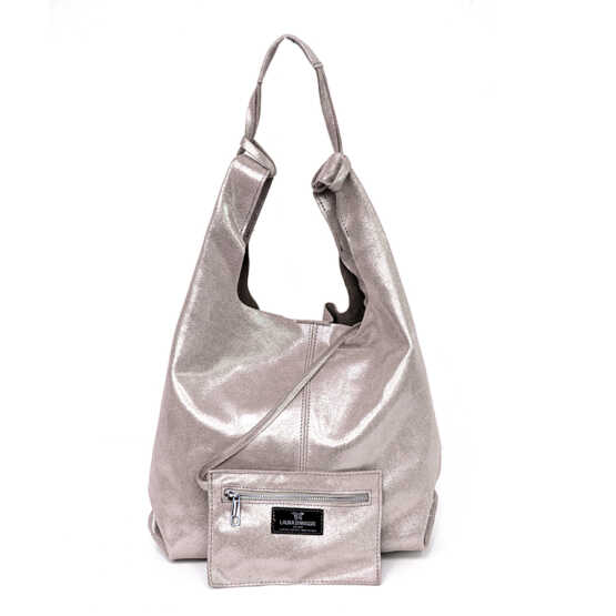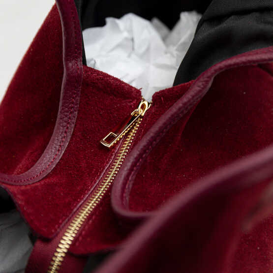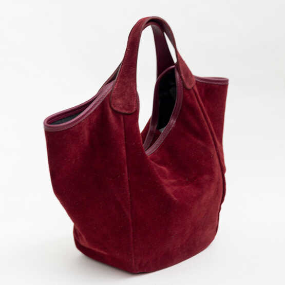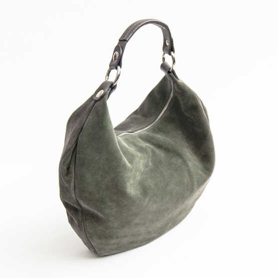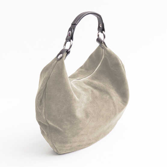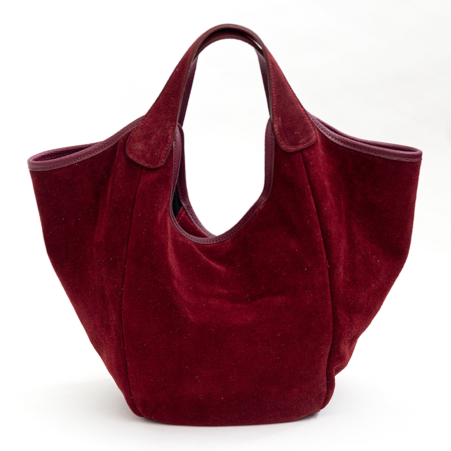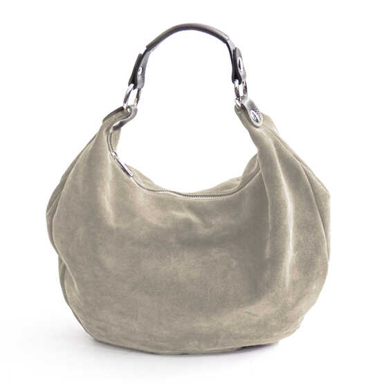 Borsa di medie dimensioni realizzata in camoscio. Doppio manico portabile sottospalla e chiusura a zip. Interno foderato con tasche.